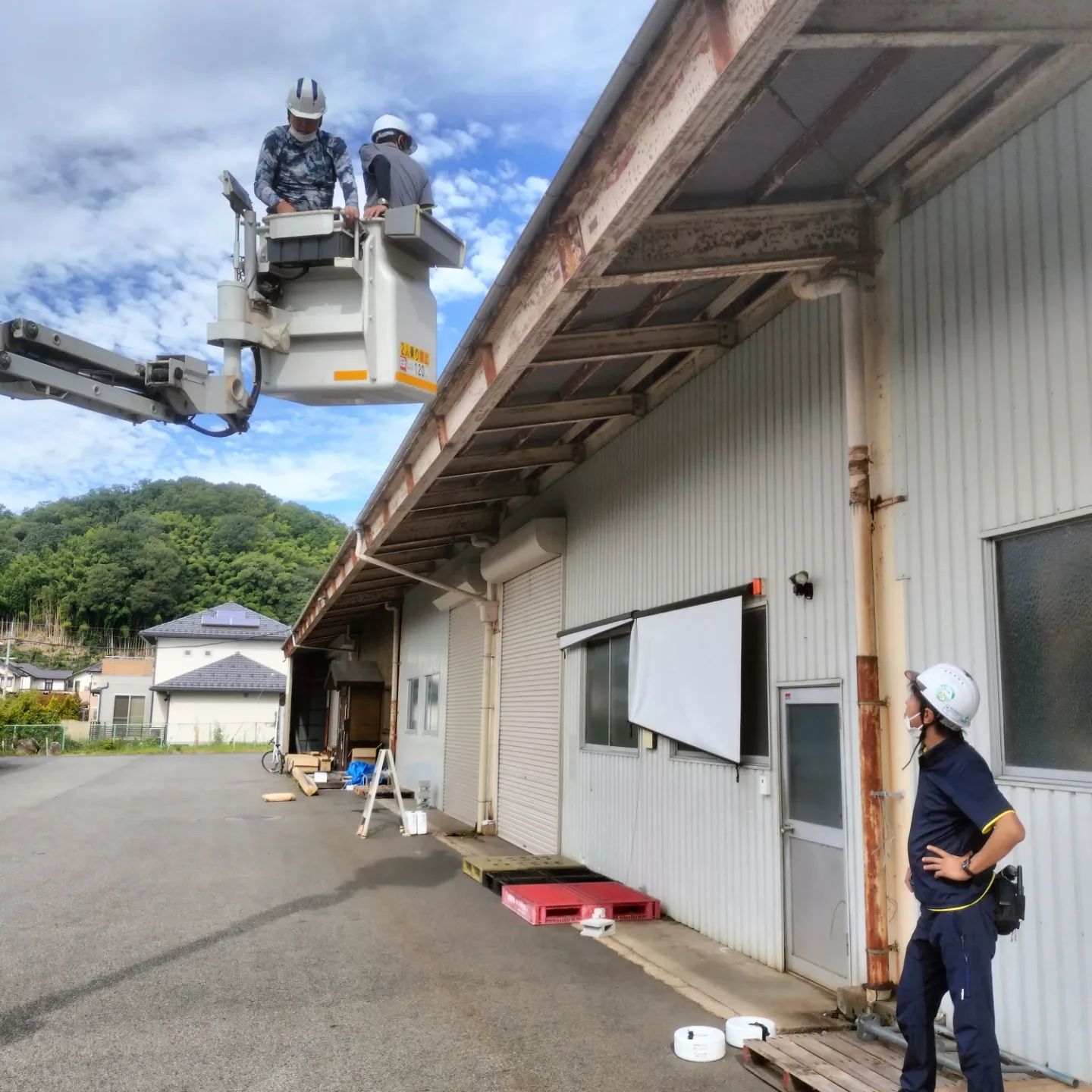 高さが4mという高所のため、バケット車を使用しながら施工します🙌